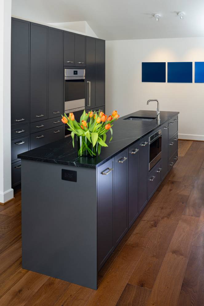 Preparing their home of 30 years to be their forever home, this builder and interior designer couple took up a remodel that would allow them to age-in-place. Already living on one floor, the homeowners removed several walls to create this updated open plan modern, minimal look with clean lines. A fan of the designs of fellow designers Axel Vervoordt, Ilse Crawford and John Saldino, the homeowner worked with her Wood-Mode kitchen designer to blend the inspiration of scale, textures and the ‘old and new’ into her new kitchen by selecting Milan doors in Iron Gray and Vanguard Plus doors in a custom matte finish. The addition of the stone-like marble countertop invokes a balance of modernity with sustainability.