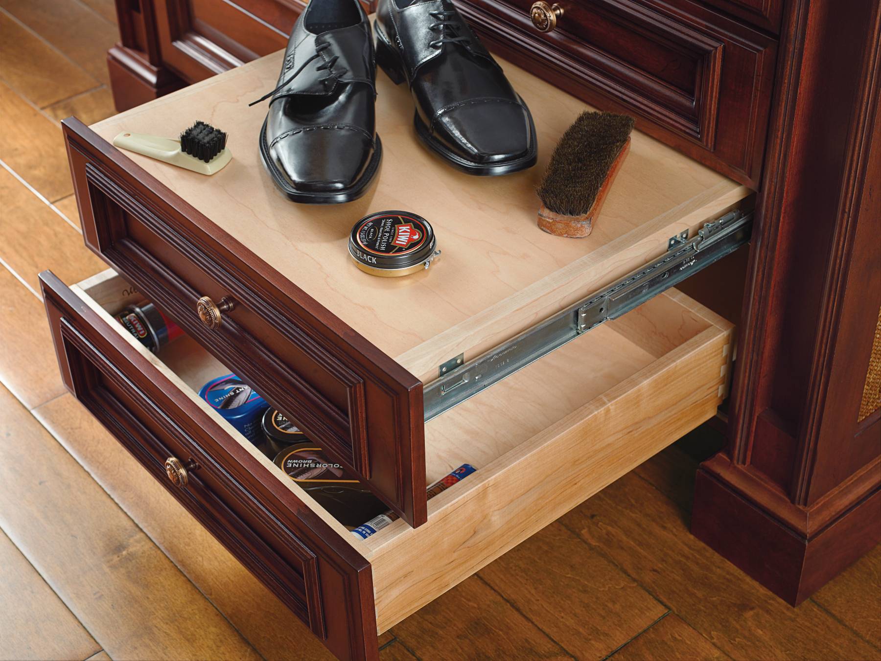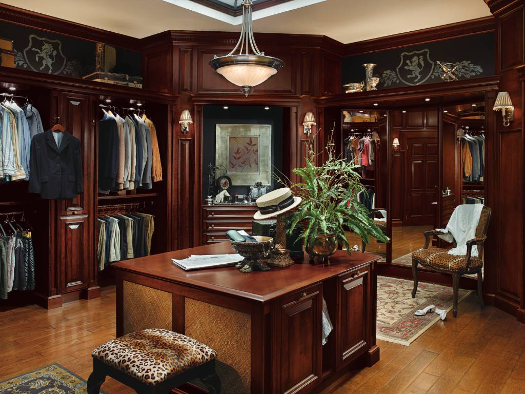 Just as accessories tie together a gorgeous outfit, these finishing touches can also enhance the design of your custom closet. Add a touch of style to the room with interesting cabinet hardware or elegant lighting fixtures. Experiment with bolder design choices such as creative wallpaper or extending wall color across the ceiling. Glass-front or mullion cabinetry doors create a beautiful display for items that hold meaning to you such as purses or shoes that can double as decor items. Thoughtful features like a pull-out shoe care platform or sumptuous vanity seating can also elevate your design – and the experience you’ll have when using your new space.