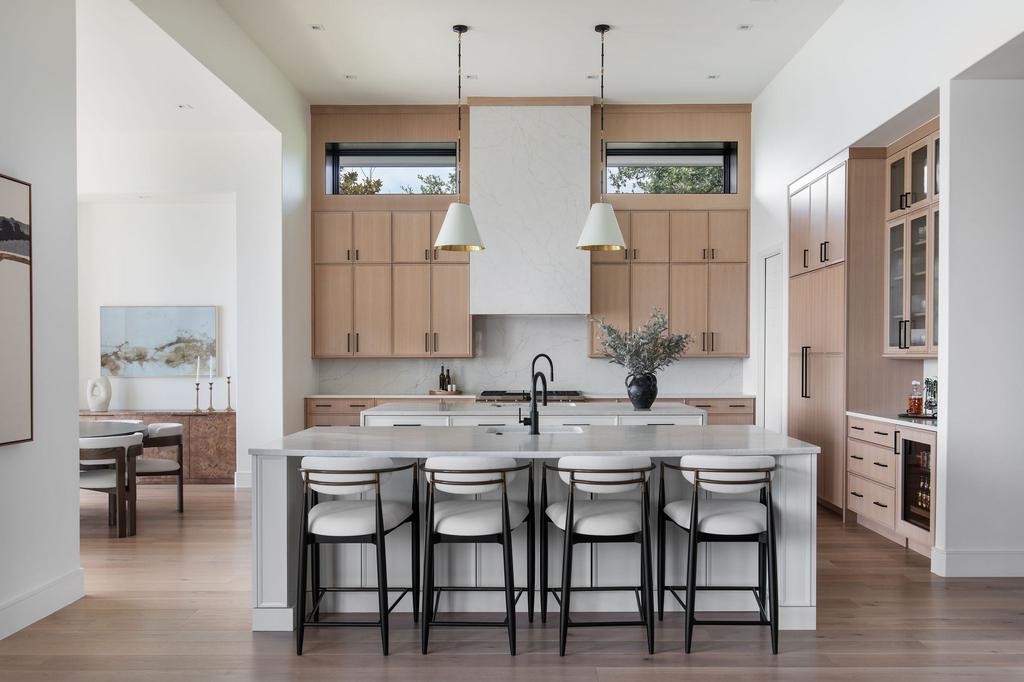 Naturally inspired accents of crafted stone, metal, and wood provide texture and detail within the design. Hand-hewn elements in complementing tones of saturated colors add depth and definition against the organic color palette. Incorporating these features as lighting fixtures, cabinetry hardware, or functional décor items provides visual interest without disrupting the harmony of the simplistic design.